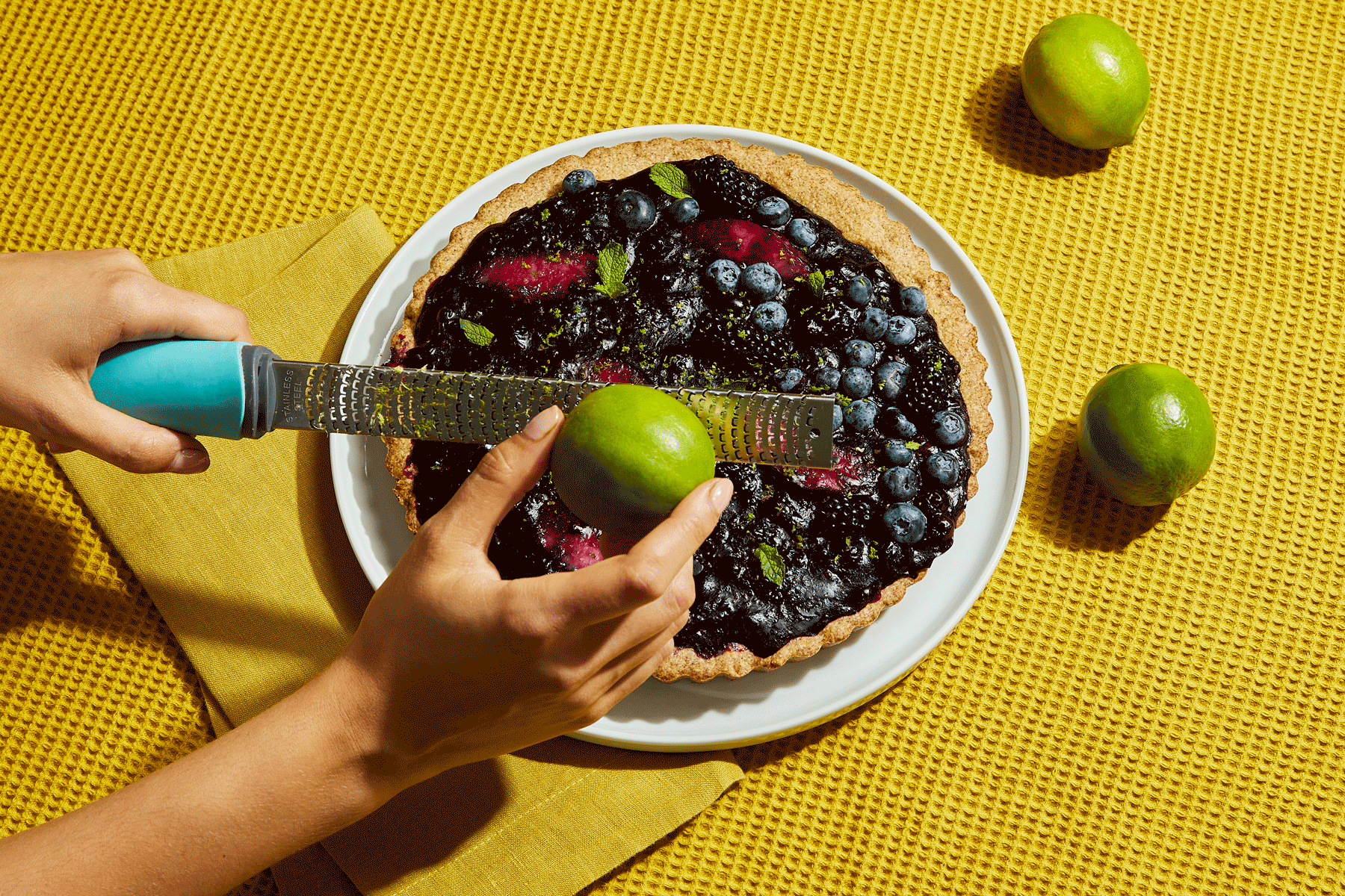 5. Pour the mixture into the baked tart shell, note that there might be more “filling” than can fit in the shell so just fill the shell enough so that there is still a solid ring of shell remaining. While the filling is still hot, arrange the fresh berries on top. Allow to cool until the filling is jelly-like, garnish with mint and lime zest. Remove from the tart shell and serve, excellent with a side of vanilla ice cream. Also good after chilling.